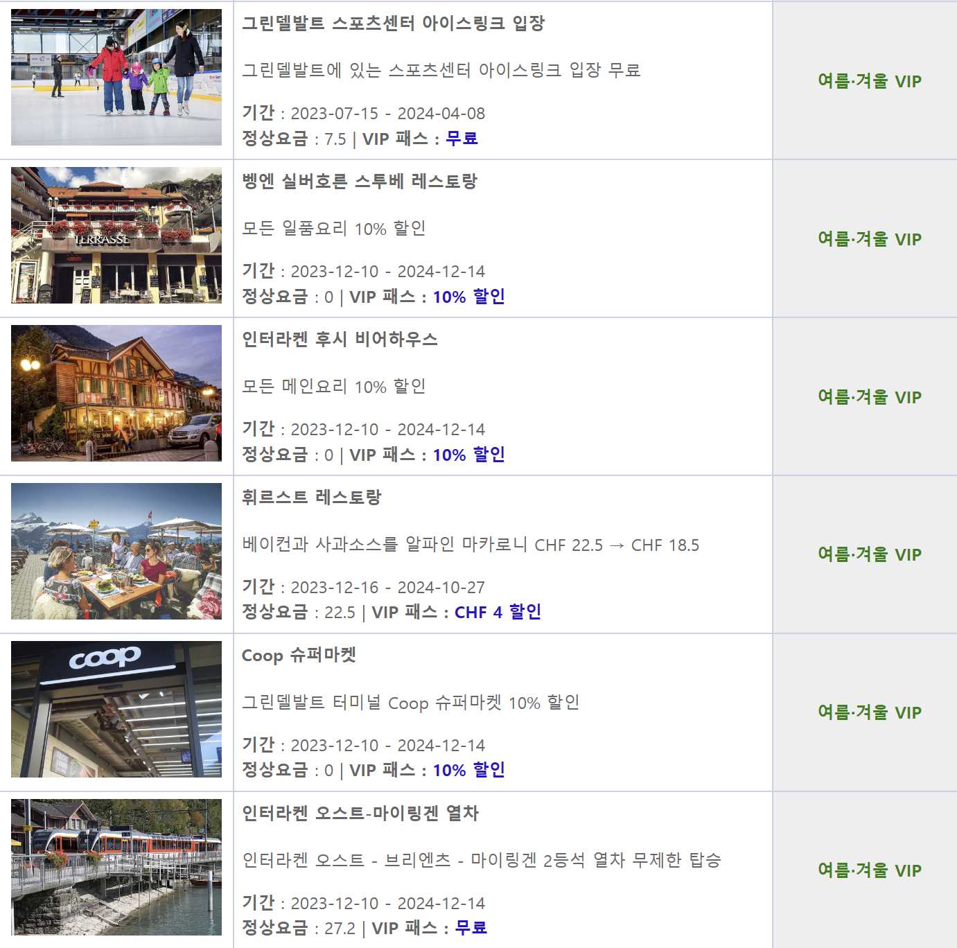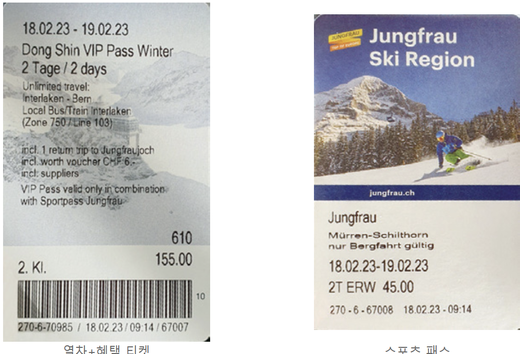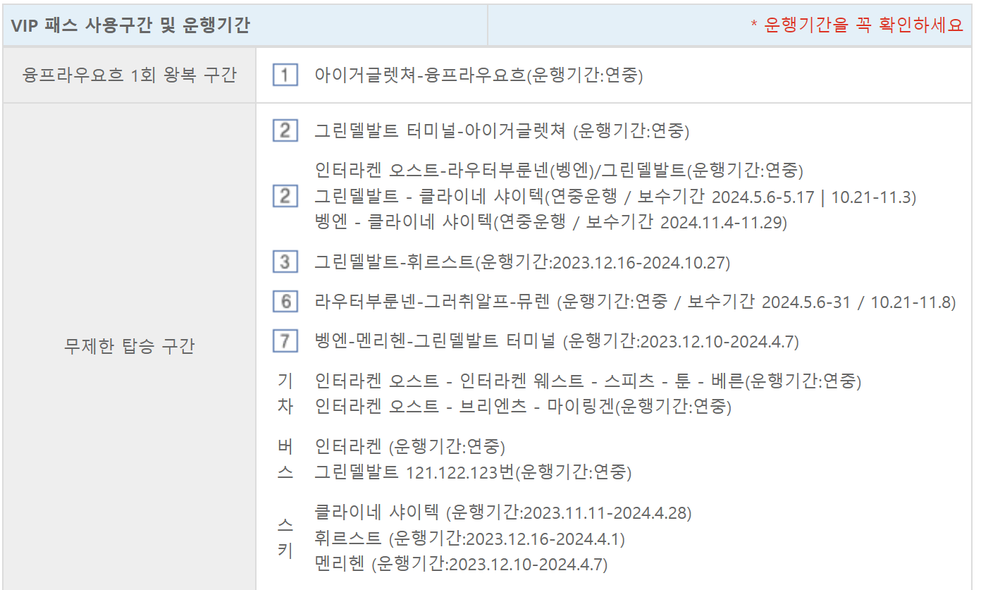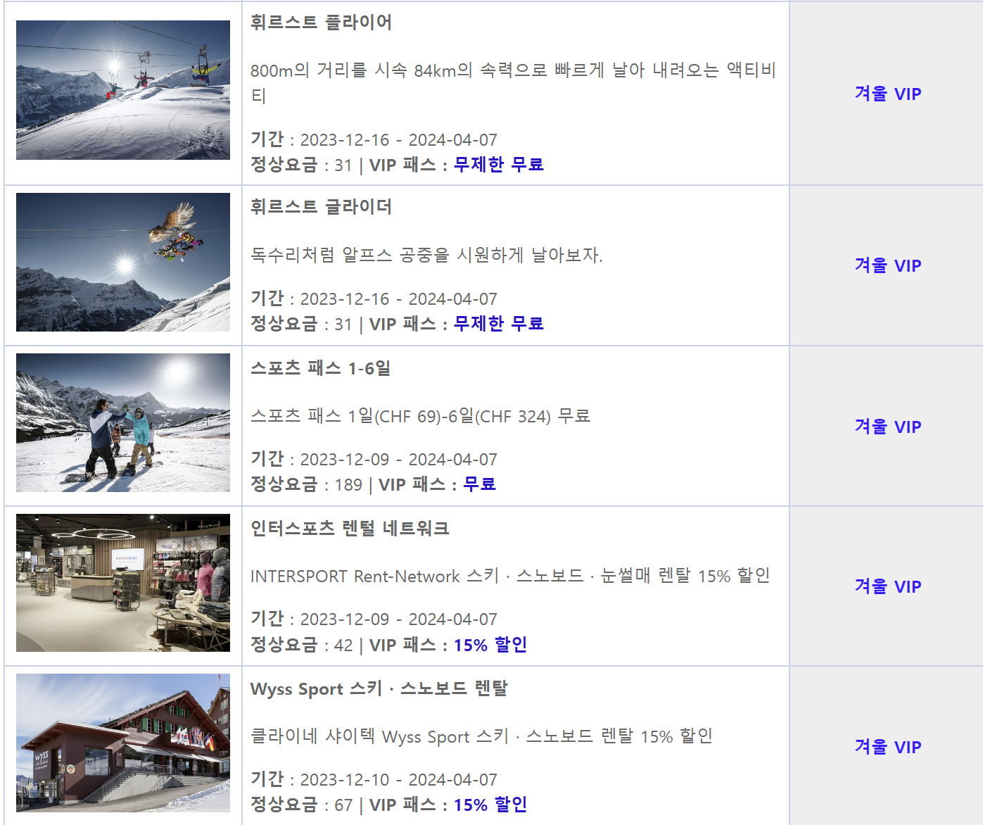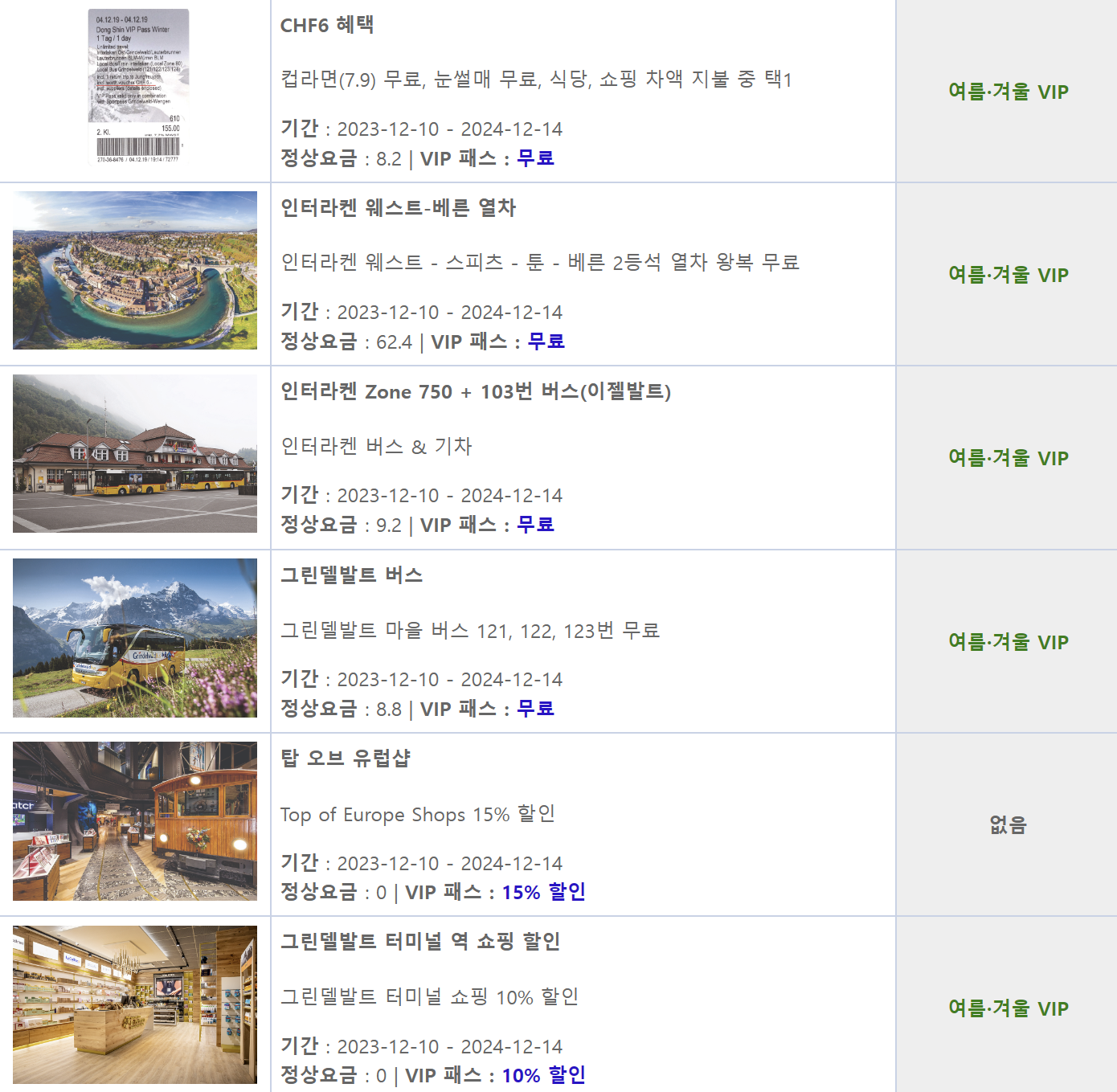 인터라켄 웨스트-베른 열차 등이 있습니다. 여름,겨울 공통으로 혜택이 있거나 겨울 vip혜택으로 액티비티 혜택 등이 있습니다. (사진 참고하세요.)
