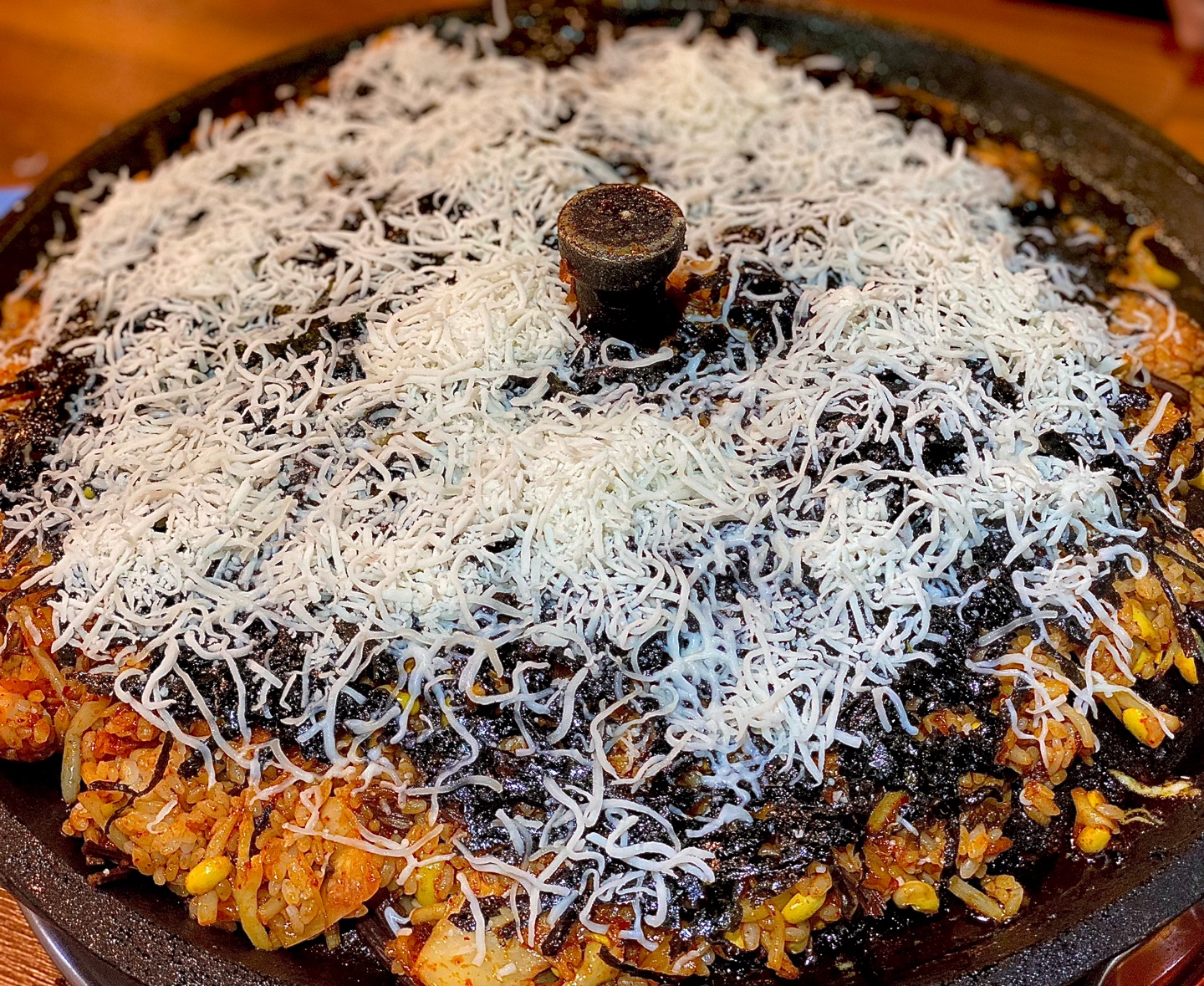 각종 야채와 사장님의 비밀소스와 김가루를 볶아주시고 마지막에 눈꽃 치즈를 올려주시는데 배부르지만 끝까지 먹게 된다.