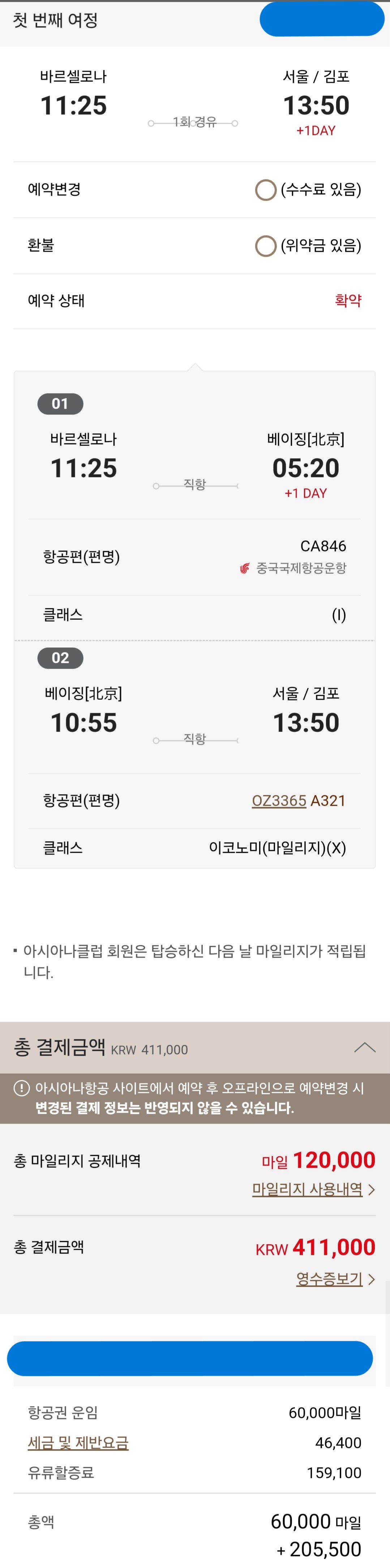 바르셀로나 - 베이징, 베이징 - 인천 구간 따로 예약했으며, 경유 시간이 너무 길어서 베이징 - 인천 구간은 이코노미 좌석으로 예약했습니다.