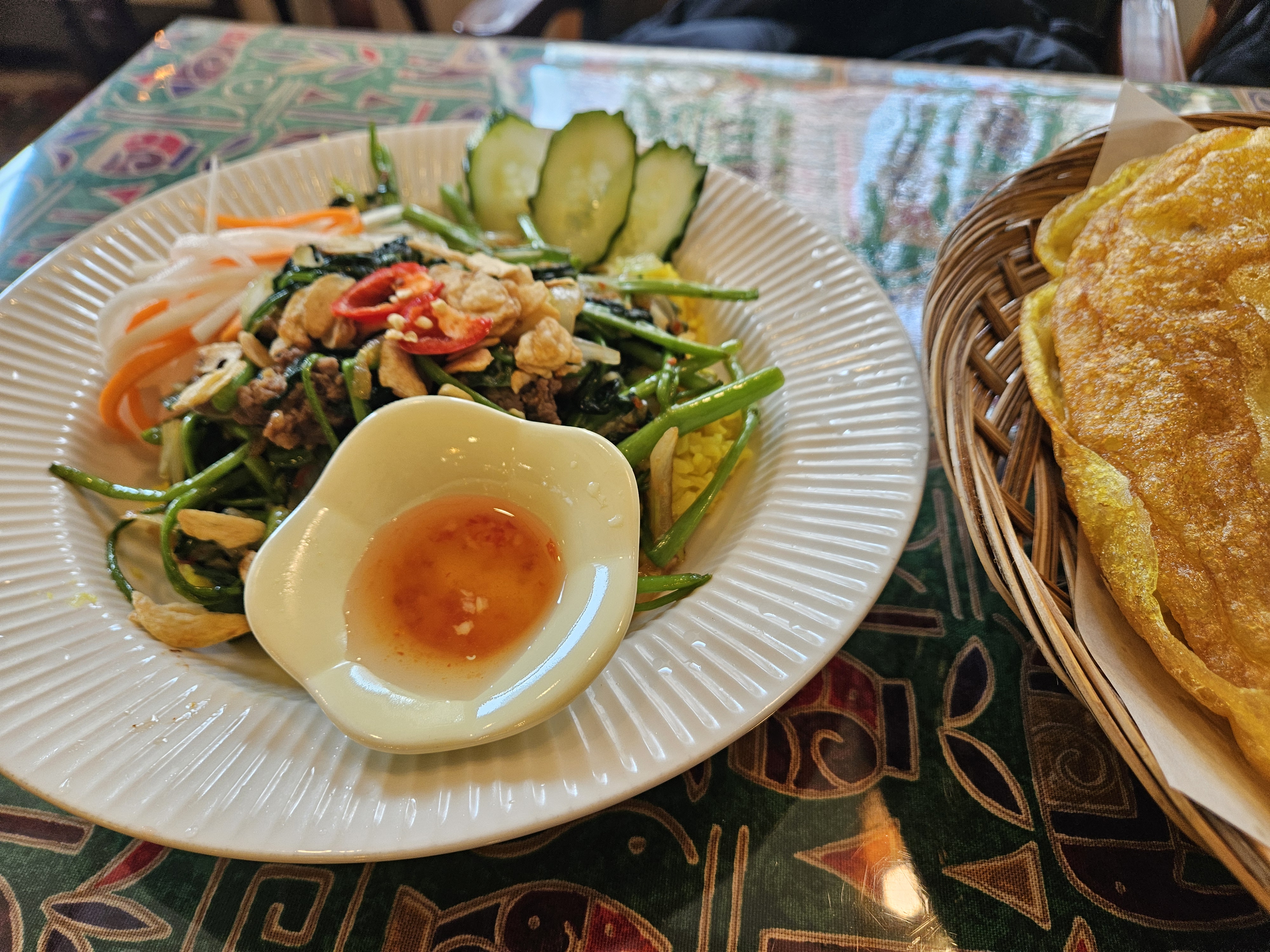 오늘도 역시나 반쎄오는 필수!!, 저번에 왔을 때 품절돼서 못 먹었던 공심채 덮밥과 쌀국수 하나 주문했다.